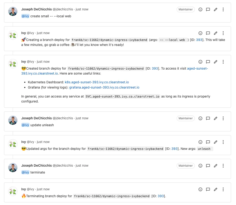 For our developers, one of the most intuitive ways to interact with Ivy is through ChatOps on an open GitLab merge request (i.e., pull request). Ivy has a fairly intuitive chat interface for creating and managing branch deploys so that branch deploys seamlessly integrate with a developer’s natural workflow.